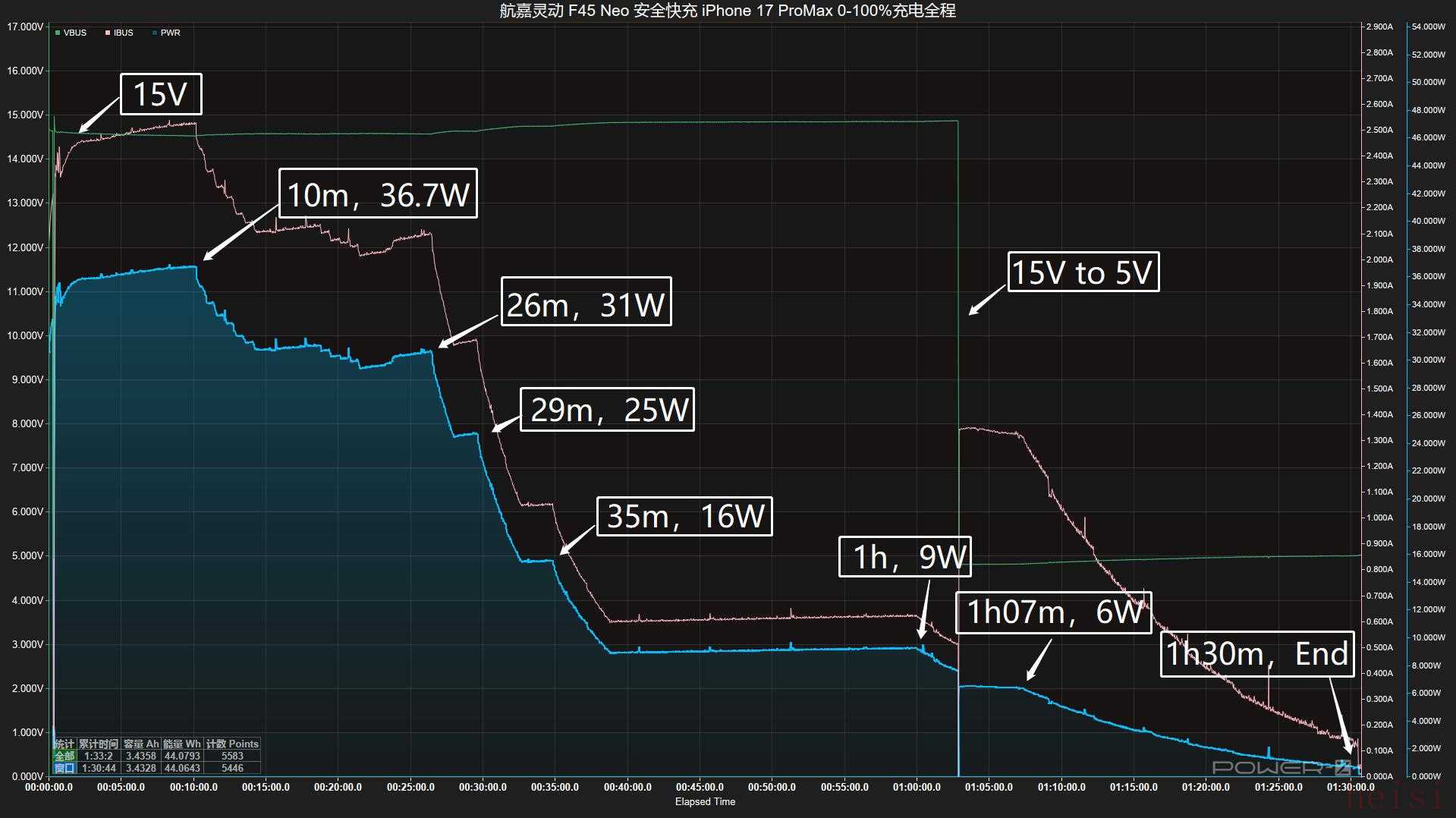 航嘉灵动 F45 Neo 安全快充 最大支持功率 PD 45W充电,在测试设备方面充电头网选用了 iPhone 16 Pro Max 作为测试对象,将 航嘉灵动 F45 Neo 安全快充 与 iPhone 17 Pro Max 放置于25℃的恒温箱中,并接通电源,测试结果如下。