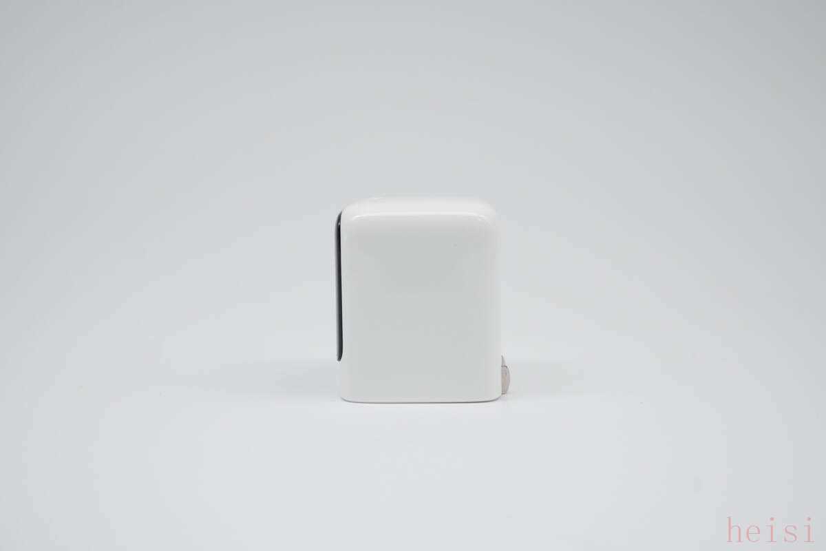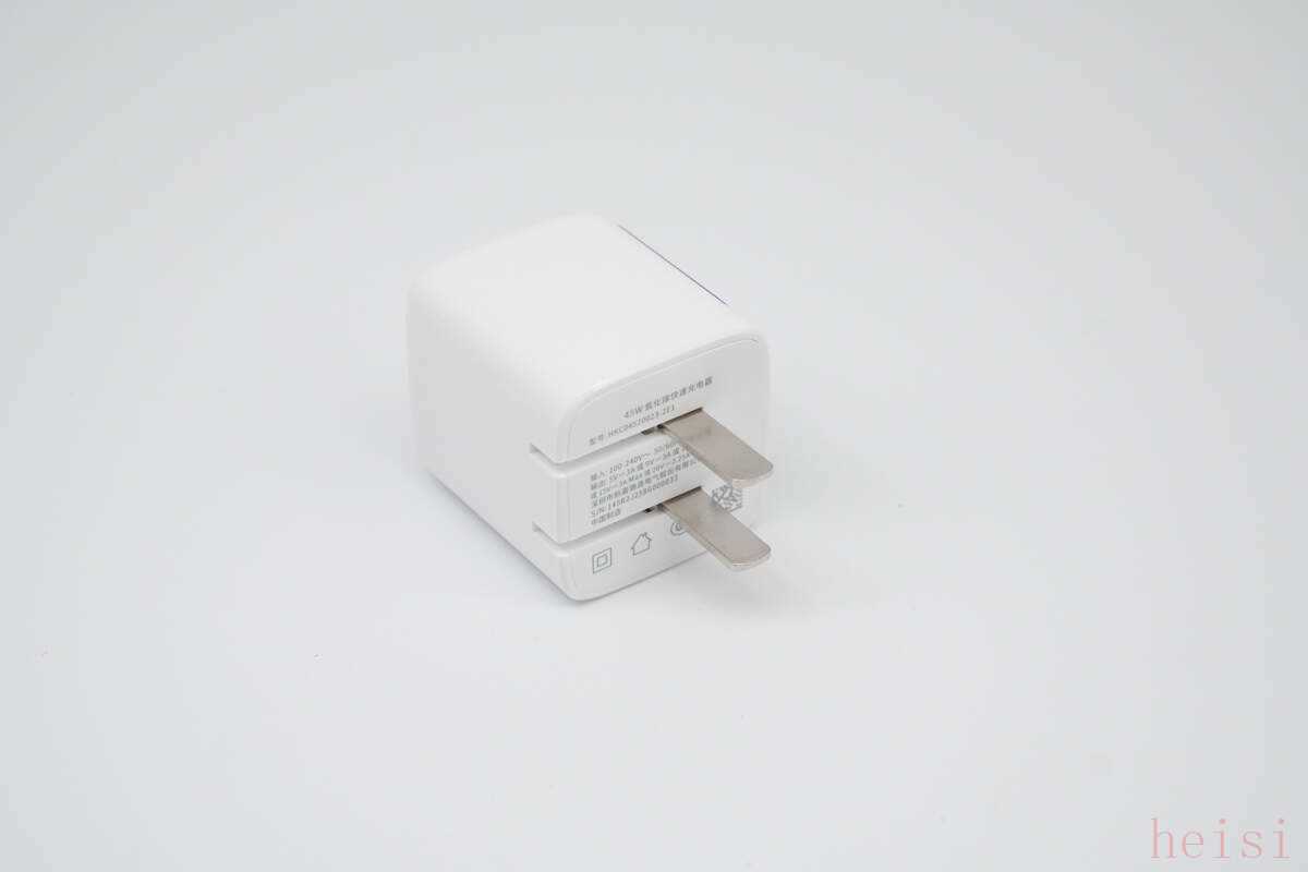 充电器整体呈白色,设计简约大方,底部配备可折叠的金属插脚,便于收纳和携带。