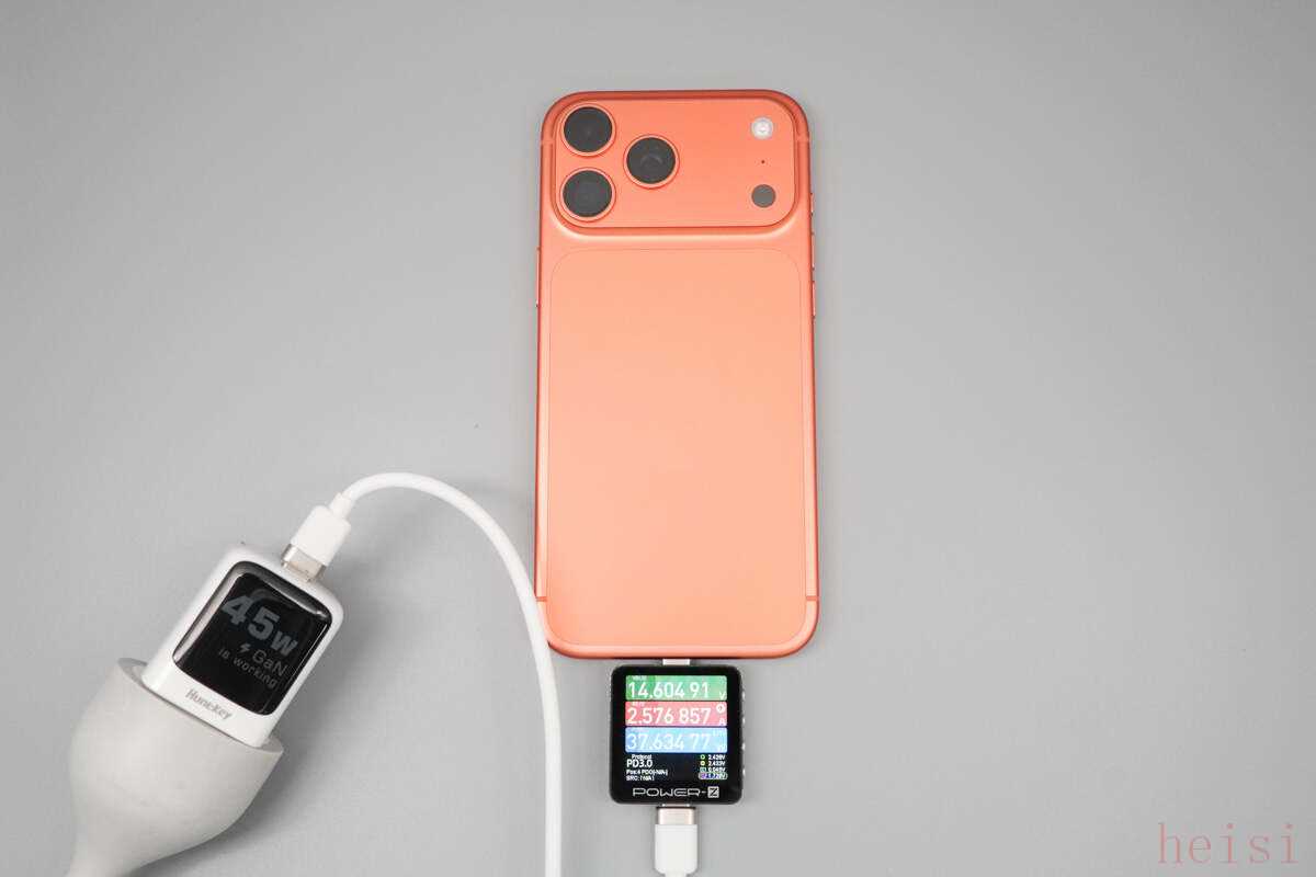 使用航嘉灵动 F45 Neo 安全快充给iPhone 17 Pro Max充电,POWER-Z KM003C测得功率为14.60V 2.58A 37.63W。