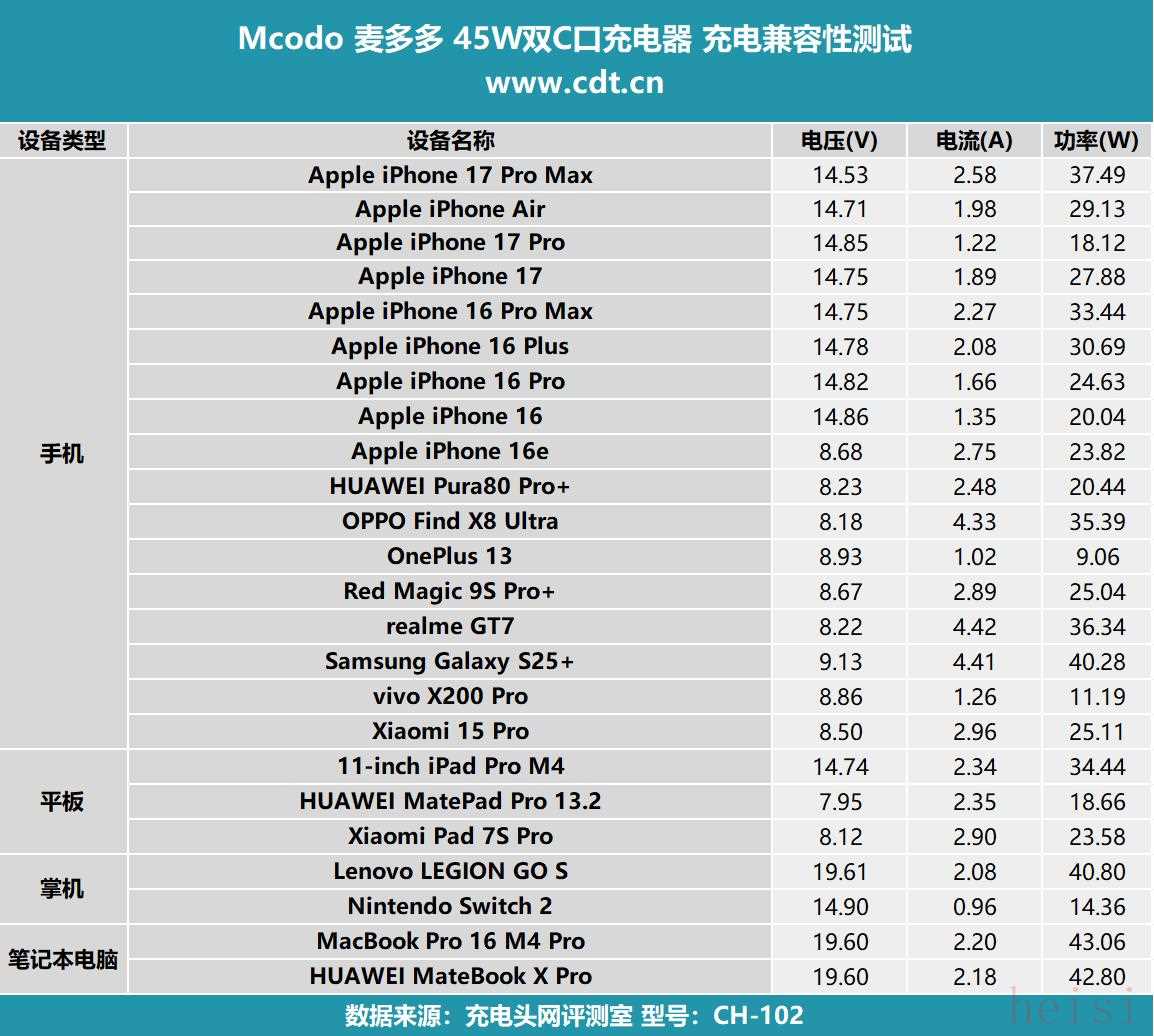 兼容性测试环节可以清楚的得知充电器为各个设备的充电情况,充电头网会使用数十款设备搭配充电器进行测试,为读者呈现真实的测试数据。