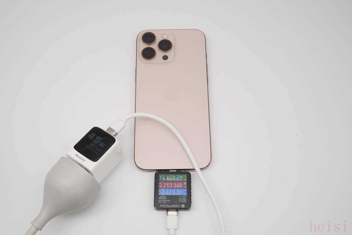 使用航嘉灵动 F45 Neo 安全快充给iPhone 16 Pro Max充电,POWER-Z KM003C测得功率为14.64V 2.21A 32.41W。