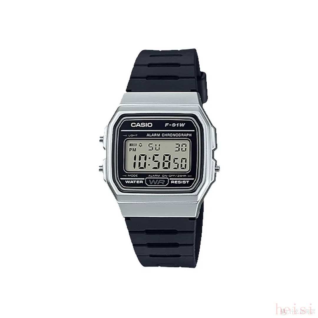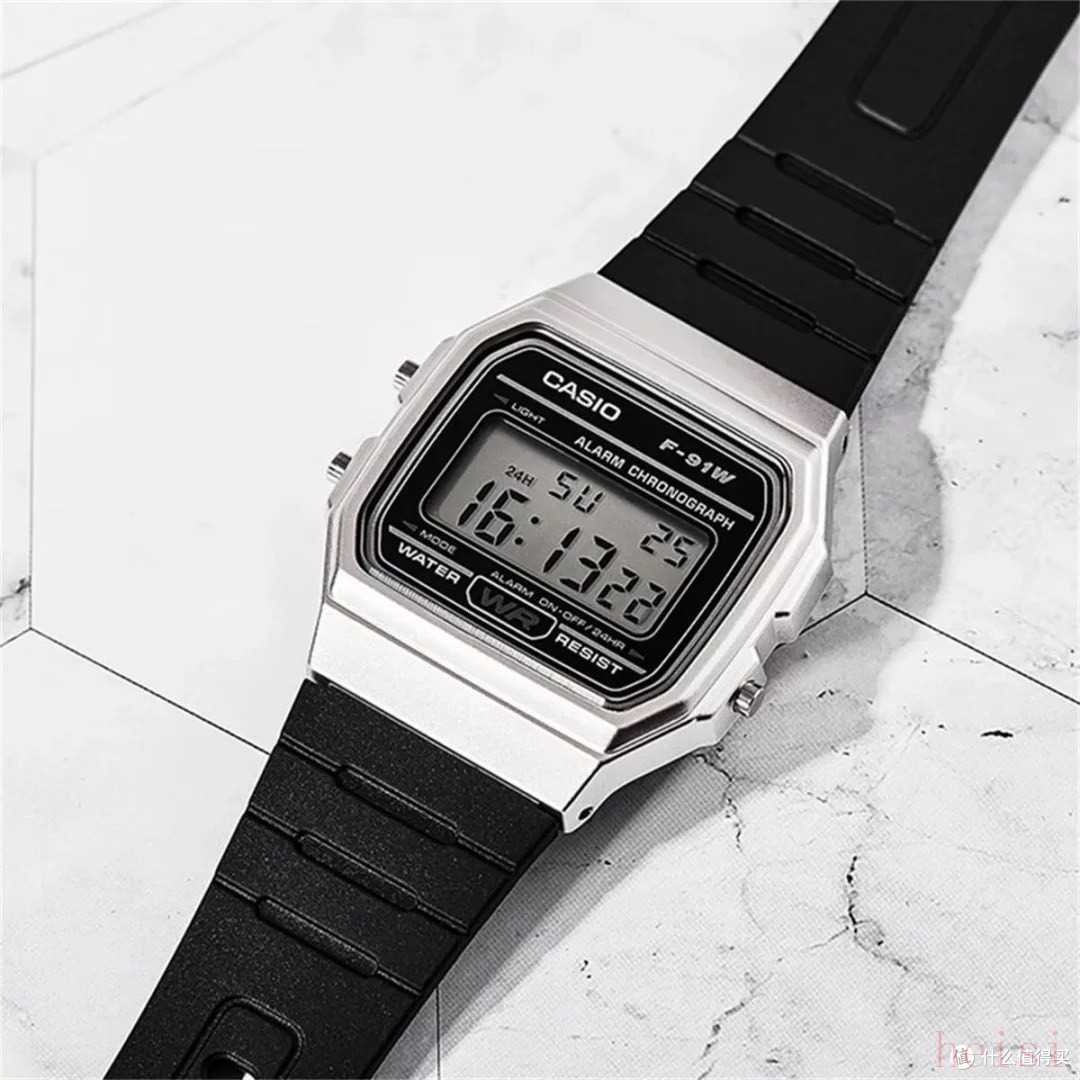 F-91WS的传奇基因,始于1989年诞生的F-91W经典款。作为卡西欧功能主义设计的代表作,设计师守谷隆之介摒弃了冗余装饰,将核心需求浓缩于38.2×35.2×8.5mm的方块之中。F-91WS延续了这一精髓,更以透明树脂表带完成时尚进化——21克的重量轻如蝉翼,佩戴时几乎无感;通透的表带搭配银色表壳,既保留了数字表的复古质感,又契合当代年轻人追捧的"极简风",无论是校服、休闲装还是轻商务穿搭,都能自然融入而不突兀。这种低调百搭的特质,让它成为学生群体的首选腕表。
