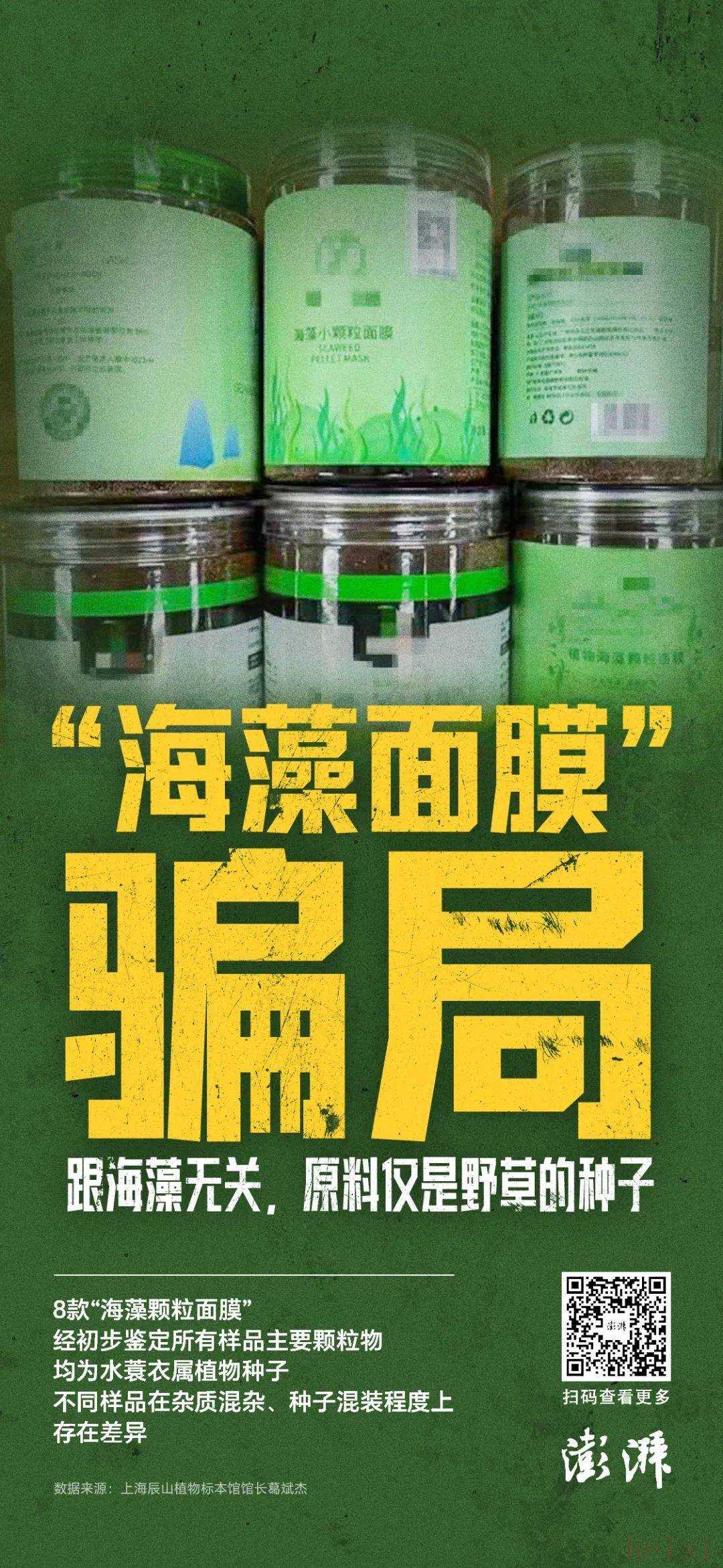一名长期关注化妆品行业的业内人士告诉澎湃新闻,目前市场上售卖的大部分海藻面膜来自广东,其他区域较少。“海藻面膜里的颗粒应该是‘南天仙子’(水蓑衣)或做冰粉的‘冰粉籽’。”