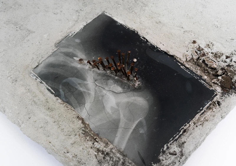 车祸造成他左侧锁骨闭锁式骨折,等待复原期间,太过疼痛的愤怒,皆化为创作原初的能量。如作品《刺 Spine》输出医疗档案尺寸的 X 光片并与铁板融合,随时间慢慢生鏽而腐蚀身体影像。