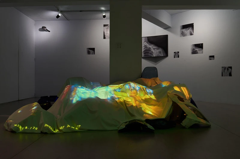以近乎解离的方式拆解生命场景的零件,再一次次重构。就像装置作品《烁动 Vague》,素白布幔以柔软又宛如裹尸布的意象包裹着机车废材。杨佳馨将22岁出车祸的监视器影像投影其上,思考着,如果重返事件发生的奇点,我们可以如何看待创伤经验的再经验?