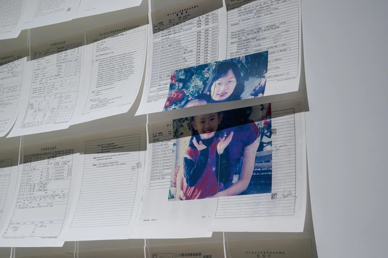 没办法代替孩子疼痛的母亲需要承受的,远比遗忘三岁的自己更加强烈,杨佳馨思索着如何与母亲一起面对。以病历号《08773545》为名的大型空间装置作品,奠基于长达460页的个人病历,是他花了两年蒐集自己三岁到23岁共五次的手术史。杨佳馨将照顾者与被照顾者的痕迹覆写上去──自己的日誌与母亲曾经的字迹,彷彿医生的注记⋯⋯临近过死亡,渴望生存下来的杨佳馨也分享,如果在创作之前,没办法离开创伤当下的状态,他会停止去做。