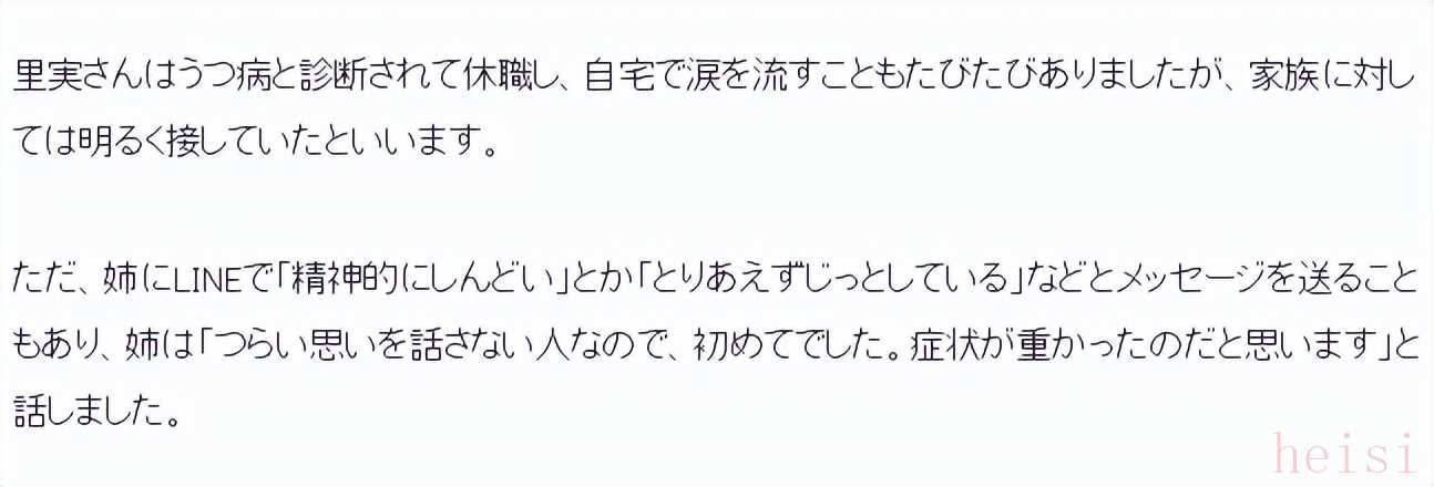 在家休养的里实也是沉浸在痛苦中,她曾发LINE给姐姐表示“精神上很痛苦”、“暂时想静静”。里实姐姐那时候就感觉到很不对劲,因为妹妹是一个从不愿把烦心事说出来的人,会对她大吐苦水,说明情况已经非常严重了。