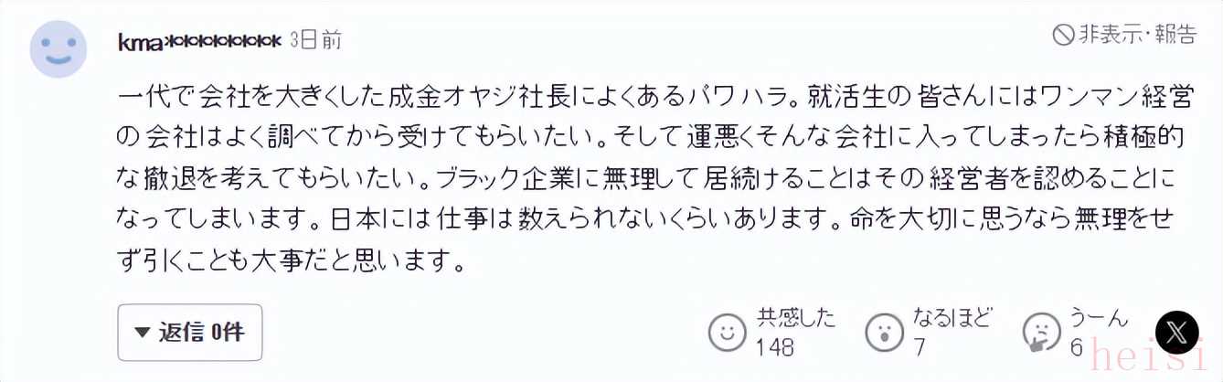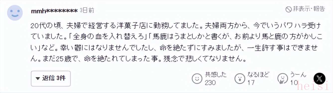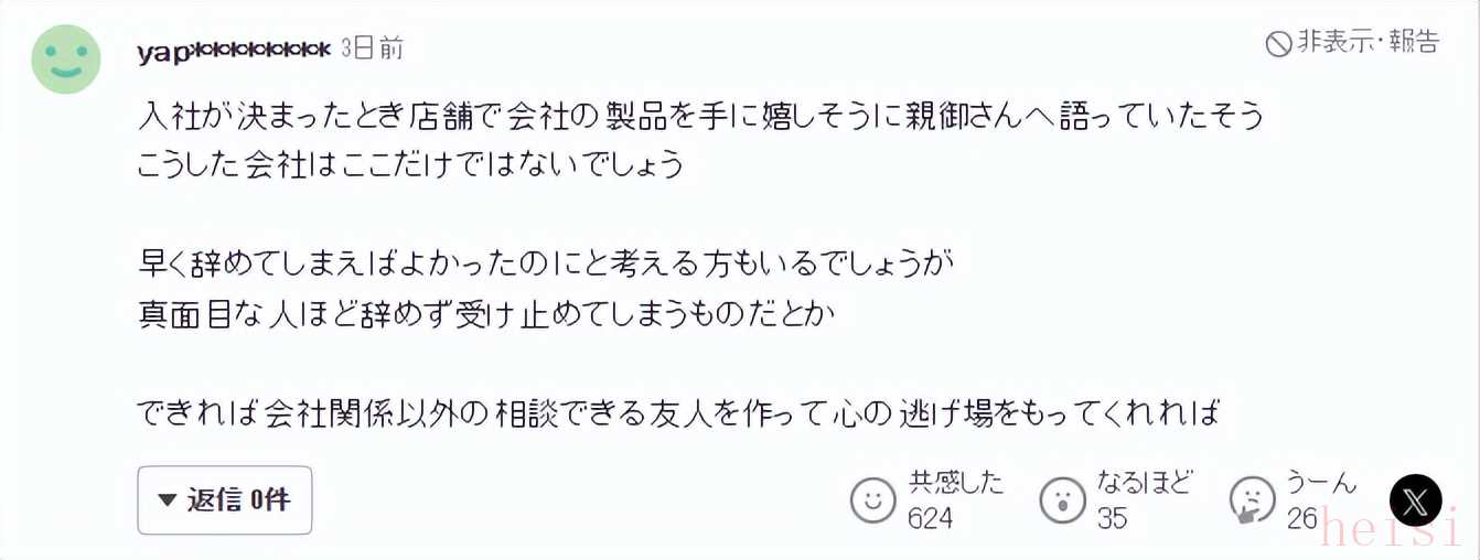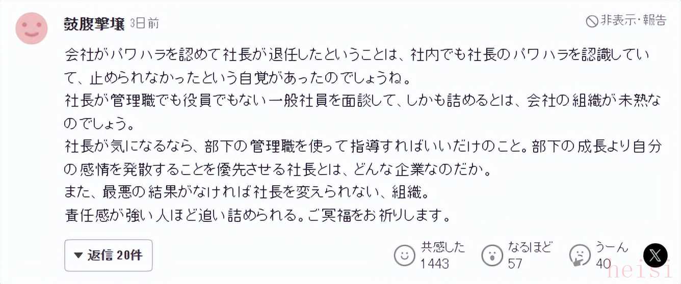 “公司承认存在职场霸凌且社长卸任,这恐怕意味着公司内部其实也清楚社长的霸凌行为,只是无力制止,并且对此怀有自觉吧。社长亲自约谈既非管理层也非董事的普通员工,甚至还步步紧逼地斥责,这应该是公司组织架构尚不成熟的表现。如果社长真的在意(员工问题),只需通过下属的管理层进行指导就可以了。把宣泄自己的情绪看得比下属的成长更重要,这样的社长,到底带领的是一家怎样的企业啊。再者,这是一个没有发生最恶劣的结果,就换不掉社长的组织。越是有责任心的人,越容易被逼到绝境。愿逝者安息。”