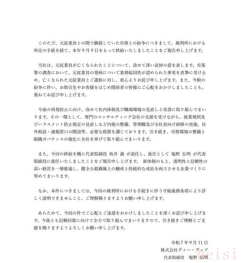 之后D-UP公司在其官网发布声明称已经向已故前员工及其家属致以最诚挚的道歉,同时确认坂井满社长已于10日卸任。