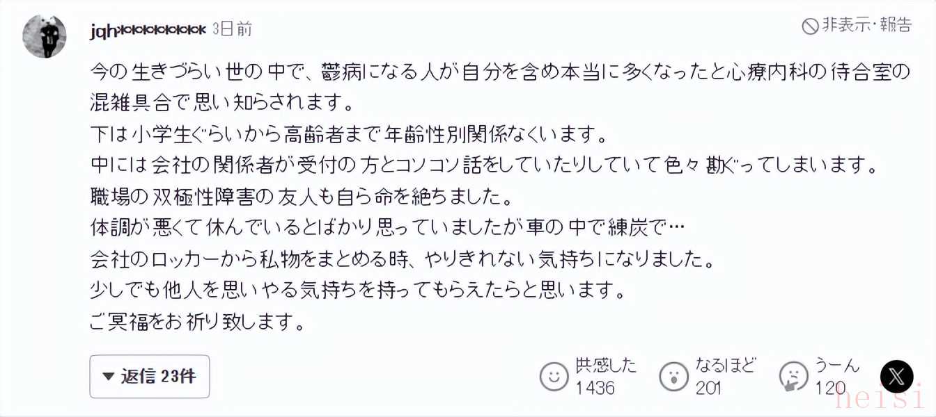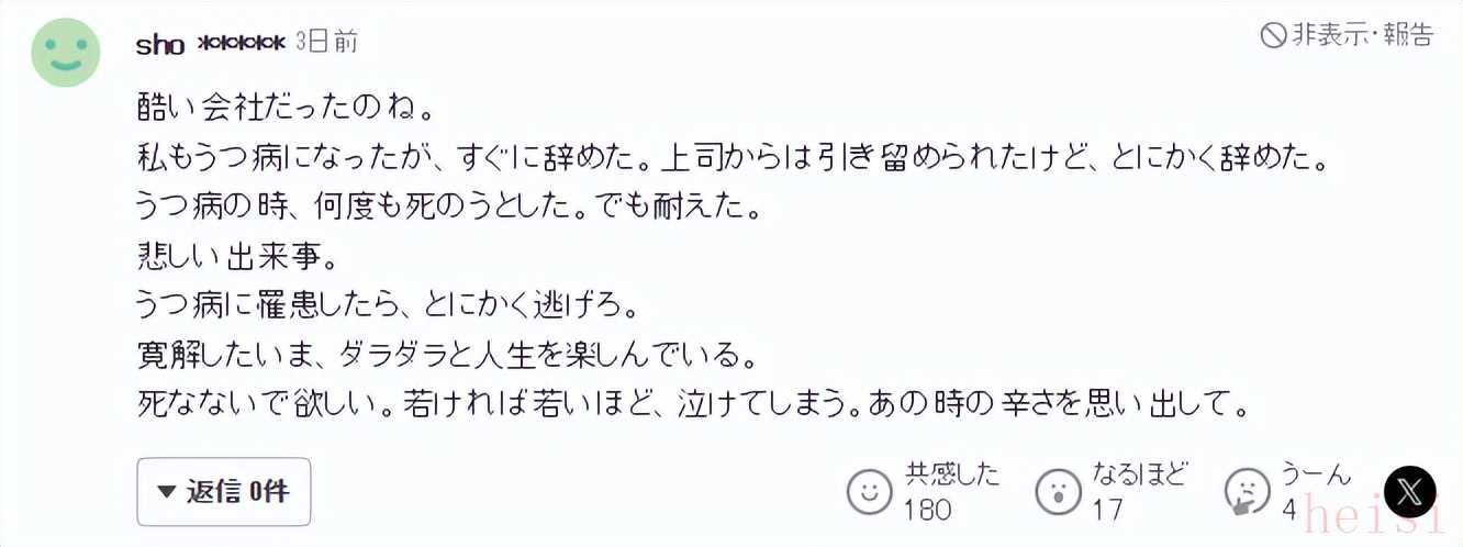 “那家公司也太过分了。我也患上过抑郁症,但很快就辞职了。虽然上司挽留了我,但我还是不管不顾地辞掉了。得抑郁症的时候,我好几次都想过死。不过还是熬过来了。真是件令人难过的事。要是得了抑郁症,不管怎样都要逃离那个环境。现在病情已经缓解了,我正慢悠悠地享受人生。真希望大家都不要死啊。越是年轻,越让人忍不住想哭。因为我想起了当时那种痛苦。”