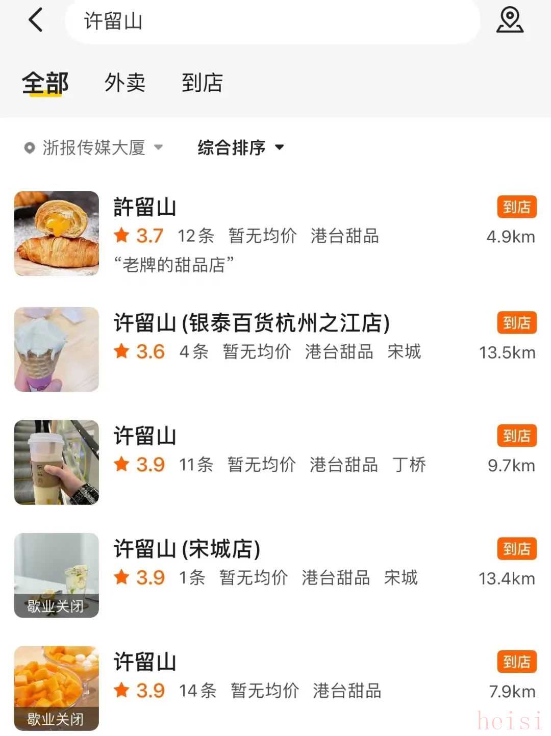 记者在某平台上搜索“许留山”发现杭州目前还剩3家其余门店都显示“歇业关闭”