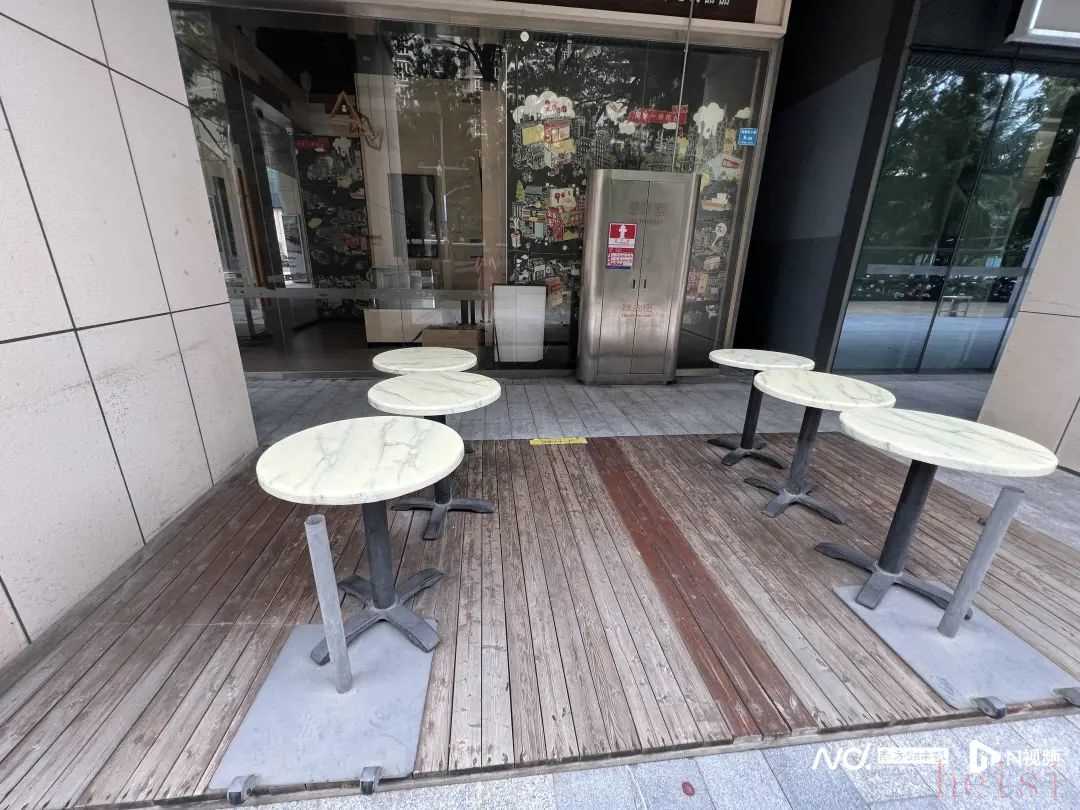 与之对比,则是门店外布满薄尘的露天桌椅。黑墙手绘的“高光时刻”与人去楼空的店面形成鲜明对比。