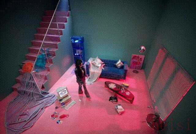 她穿皮衣,踩十五厘米的细高跟,蹲在地上玩弹珠,旁边放着一台老式CD机,红电话响了没人接。