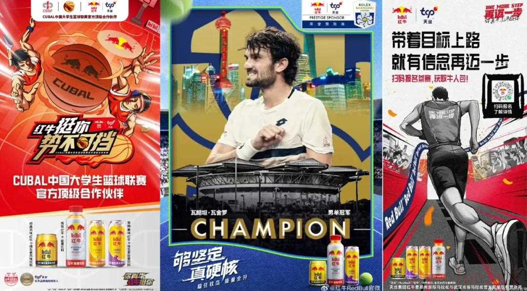 一是“基础”,红牛的品牌基因与竞技体育的内核深度同频。作为功能饮料圈的头部品牌,红牛天然具备“体育基因”。品牌一直致力于支持和赞助各项体育比赛,足球、冰球、滑雪、田径等常规运动,以及F1赛车、滑翔、跳伞等极限运动。而上海劳力士大师赛也是体现红牛品牌体育基因的绝佳载体——作为亚洲最高级别的网球赛事之一,上海劳力士大师赛不仅自带关注和话题,也与品牌调性高度契合。网球运动的比赛时长经常超过三小时,对于球员而言,竞技过程早已超越了纯粹的身体较量,更是对体能储备与心理韧性的双重考验,这不仅契合了产品“随时补能”的功效,更是对红牛“挑战自我,突破极限”品牌精神的生动诠释。通过赛事赞助、明星代言等多重加持,红牛成功将体育精神、产品功能与情感认同融为一体,构建出完整的品牌沟通闭环。