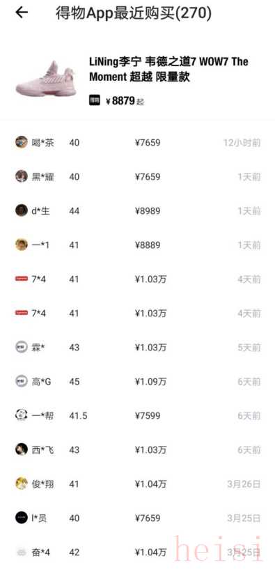 又如李宁韦德之道7 wow7 The Moment超越限量款,41.5码最高售价为29999元,相比发售价1699元涨了近17倍。同时,最近购买数据达270条,12小时前刚成交一笔。