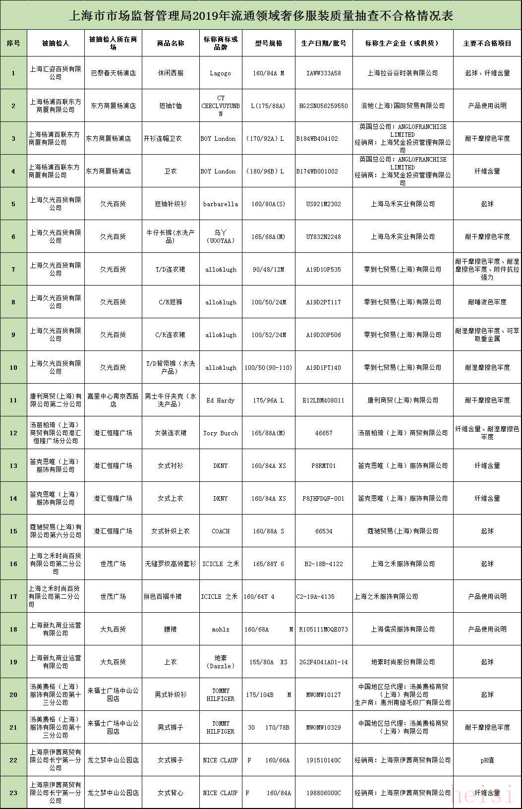 中新网客户端12月4日电(谢艺观) 近期,上海市场监管局对上海市流通领域销售的125批次奢侈服装进行质量抽查发现,23批次不合格,涉及BOY London(伦敦男孩) 、Tory Burch(汤丽柏琦) 、DKNY(唐可娜儿)、Coach(蔻驰)、地素、Tommy Hilfiger(汤米·希尔费格)等品牌。不合格项目包括pH值、附件抗拉强力、色牢度、可萃取重金属等强制性标准。
