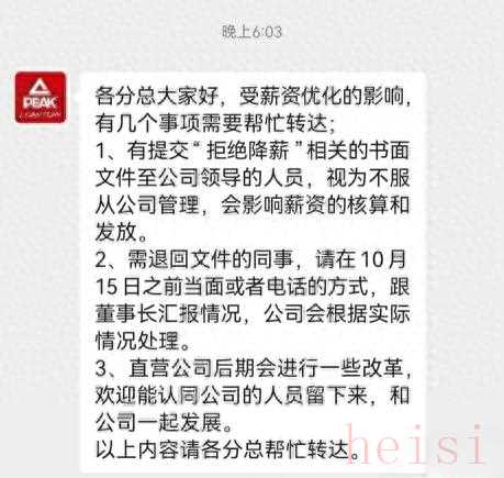 多位匹克员工向记者确认网传图片,截图显示匹克总部向分公司领导发布消息,称受薪资优化的影响,有提交“拒绝降薪”相关的书面文件至公司领导的人员,视为不服从公司管理,会影响薪资的核算和发放。需退回文件的同事,请在10月15日之前当面或者电话的方式,跟董事长汇报情况,公司会根据实际情况处理。直营公司后期会进行一些改革,欢迎能认同公司的人员留下来,和公司一起发展。