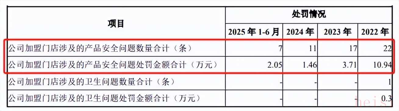 问询回复显示,报告期各期及2025年上半年,孕婴世界加盟门店涉及的产品安全问题数量分别为22条、17条、11条、7条,三年半合计57条,合计罚超18万元。值得一提的是,今年上半年被处罚金额已超去年全年。
