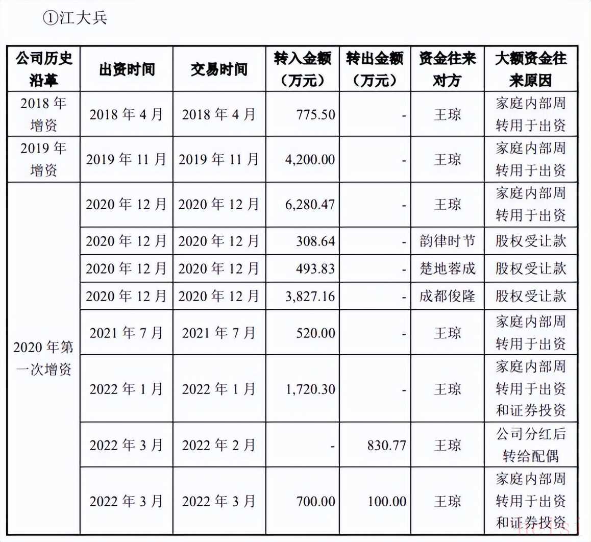 记者注意到,江大兵与其配偶王琼的大额资金往来原因,主要标注为家庭内部周转用于出资和证券投资及公司分红后转给配偶。