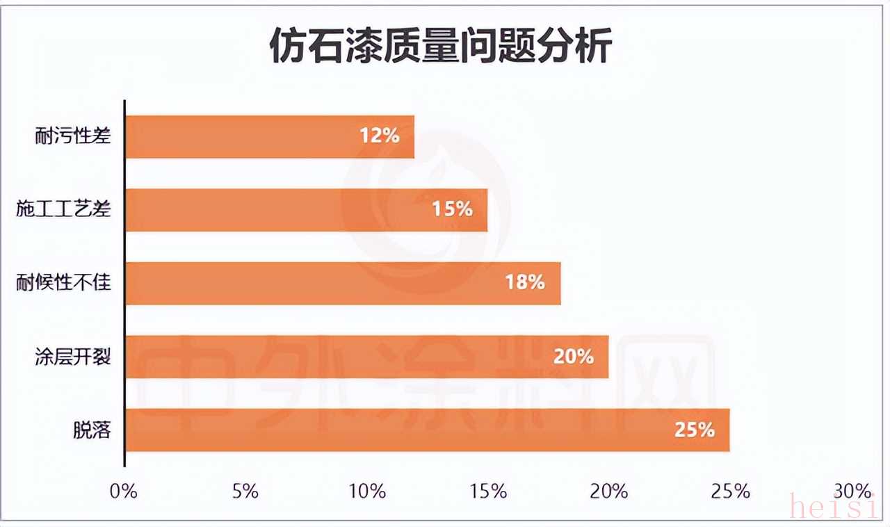 尽管仿石漆市场呈现出蓬勃发展的态势,但产品在使用过程中仍存在着一些质量问题。根据调查结果显示,脱落和涂层开裂是最常见的质量问题,占比分别为25%和20%。