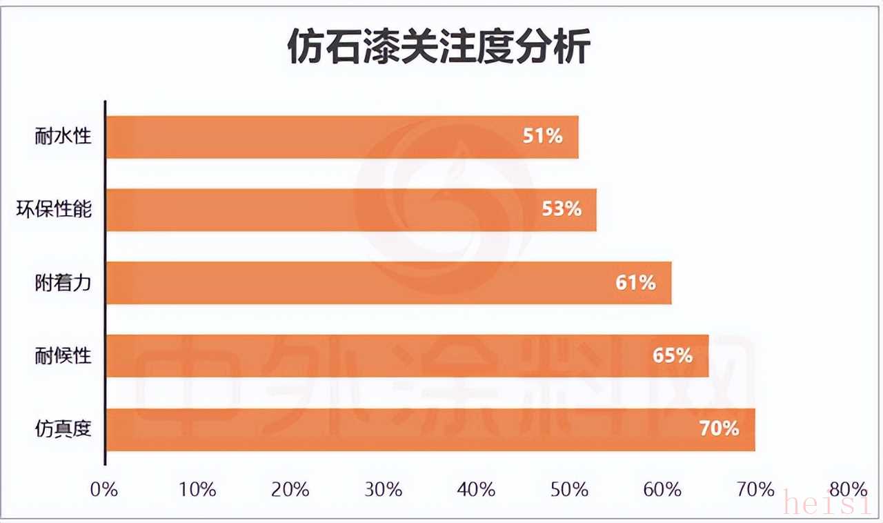 在受访者反馈中,仿石漆的仿真度、耐候性、附着力、耐水性、耐污性、硬度、遮盖力、环保性能等方面关注度较高。其中,仿真度和耐候性是最受关注的两个方面,占比分别为70%和65%。