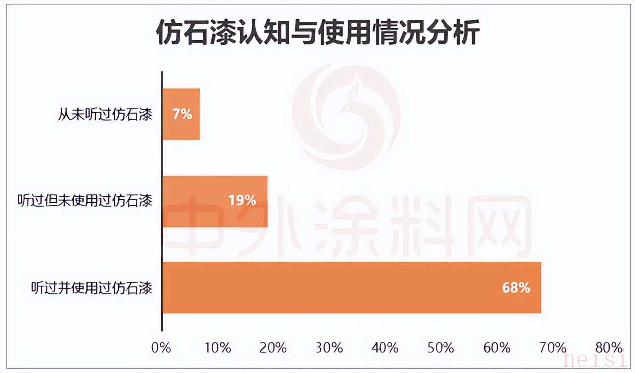 根据调查结果显示,在受访者反馈中,68%的受访者听说过并使用过仿石漆,19%的受访者仅听说过但未使用过仿石漆,7%的受访者从未听说过仿石漆。这一数据表明,当前,仿石漆在市场上的认知度相对较高,但仍有部分消费者对其不够了解或尚未使用过。