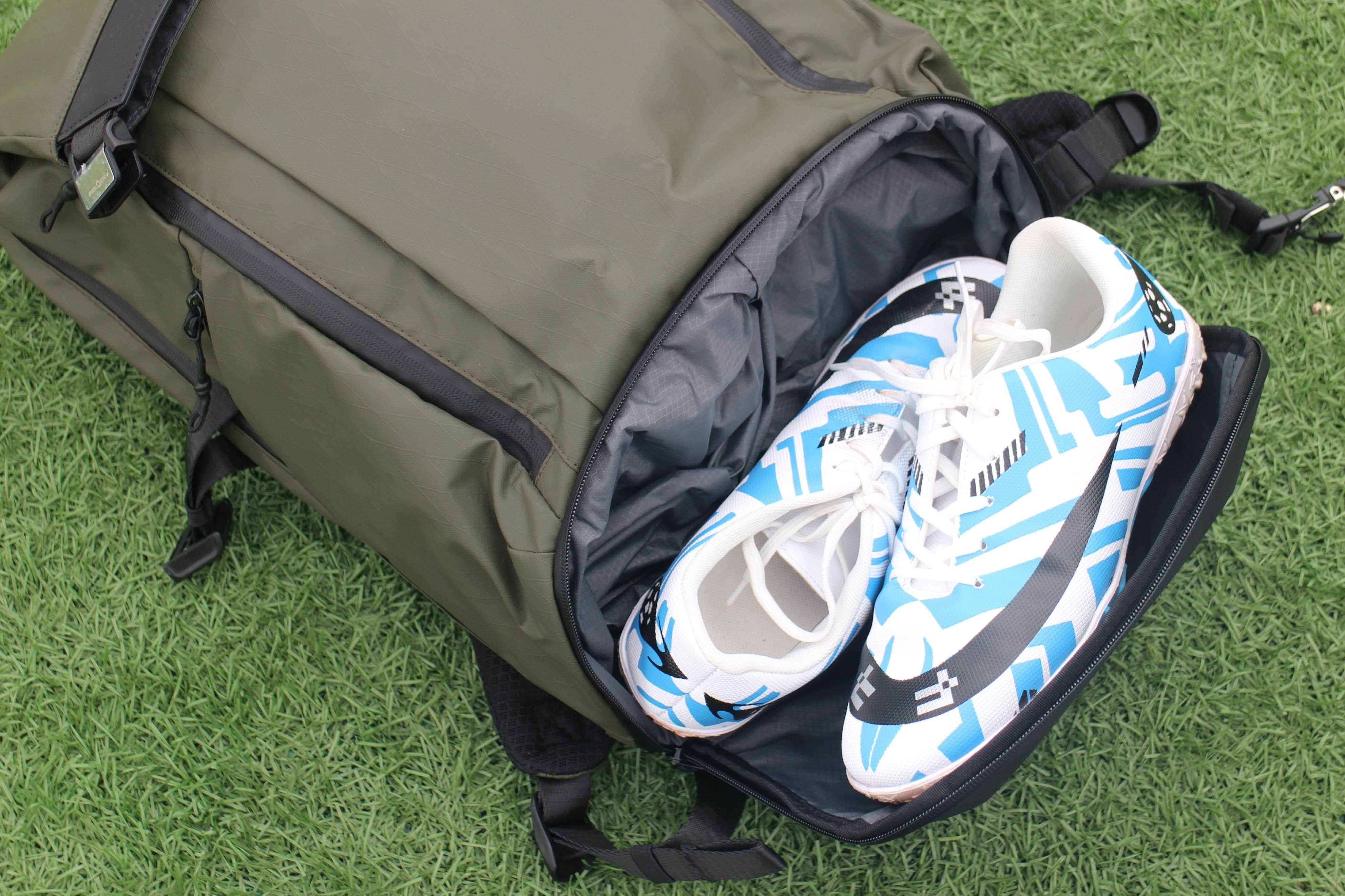独立的鞋仓,容量非常大,放入一双42码的足球钉鞋,空间充足,鞋子不会挤压变形。