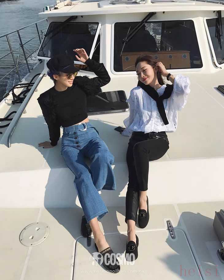 Irene Kim和Jesscia两个韩系女生不约而同的都穿上了“懒人鞋”,这样简单随性的搭配,轻轻松松赚足回头率丝毫没有难度。