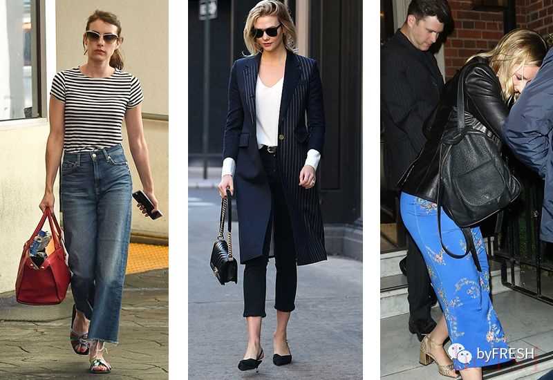 △从左到右:Emma Roberts的T恤;Karlie Kloss的牛仔裤;寡姐的皮衣外套都来自L'agence