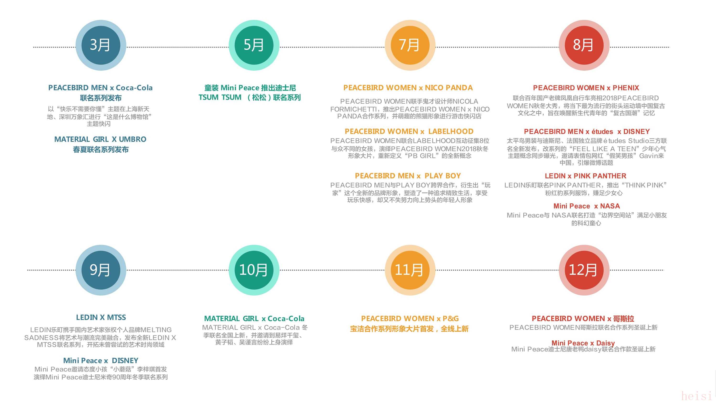 2018年,太平鸟继续加码,以货品、设计力为核心,联名频频,制造爆款效应。据不完全统计,太平鸟在过去一年跨界联名近20个系列。其中,不乏有与迪士尼、Coca-Cola、PLAY BOY、粉红豹、MTSS、NICO PANDA、凤凰自行车等时下超级IP合作。