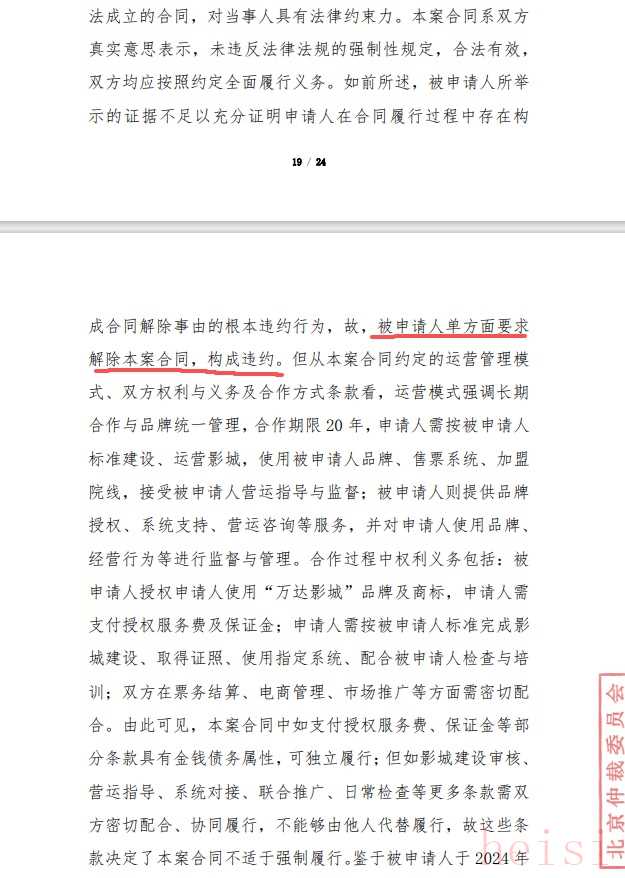 枣庄市中万达广场影城加盟商提供给九派财经记者的一份仲裁文书显示,北京仲裁委员会于2025年9月23日裁决,“被申请人(万达电影)单方面要求解除本案合同,构成违约。”另有案件中,仲裁委员会已裁决万达电影赔偿加盟商数十万元款项。