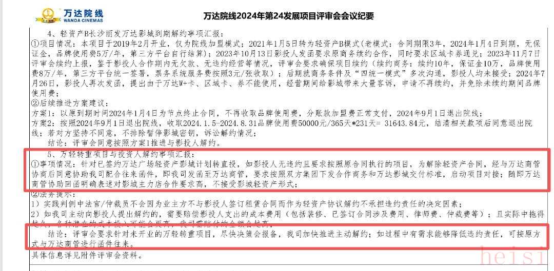 据九派财经记者获取的一份万达院线内部《发展项目评审会会议纪要》显示,针对已签约万达广场轻资产影城计划转直投,“为解除轻资产合同,经与万达商管协商后,同意协助我司配合往来函件......万达商管协助回函,明确表述对影城主力店合作要求高,不接受影城轻资产形式。”