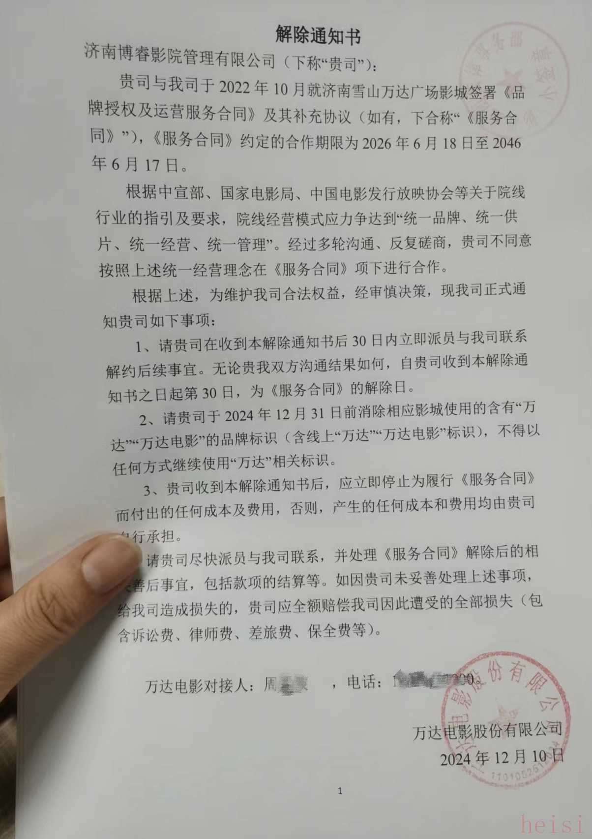 2024年12月10日,多家加盟商同时收到了万达电影股份有限公司发出的一份《解除通知书》,称“无论贵我双方沟通结果如何,自贵司收到本解除通知书之日起第30日,为上述《品牌授权及运营服务合同》的解除日。”
