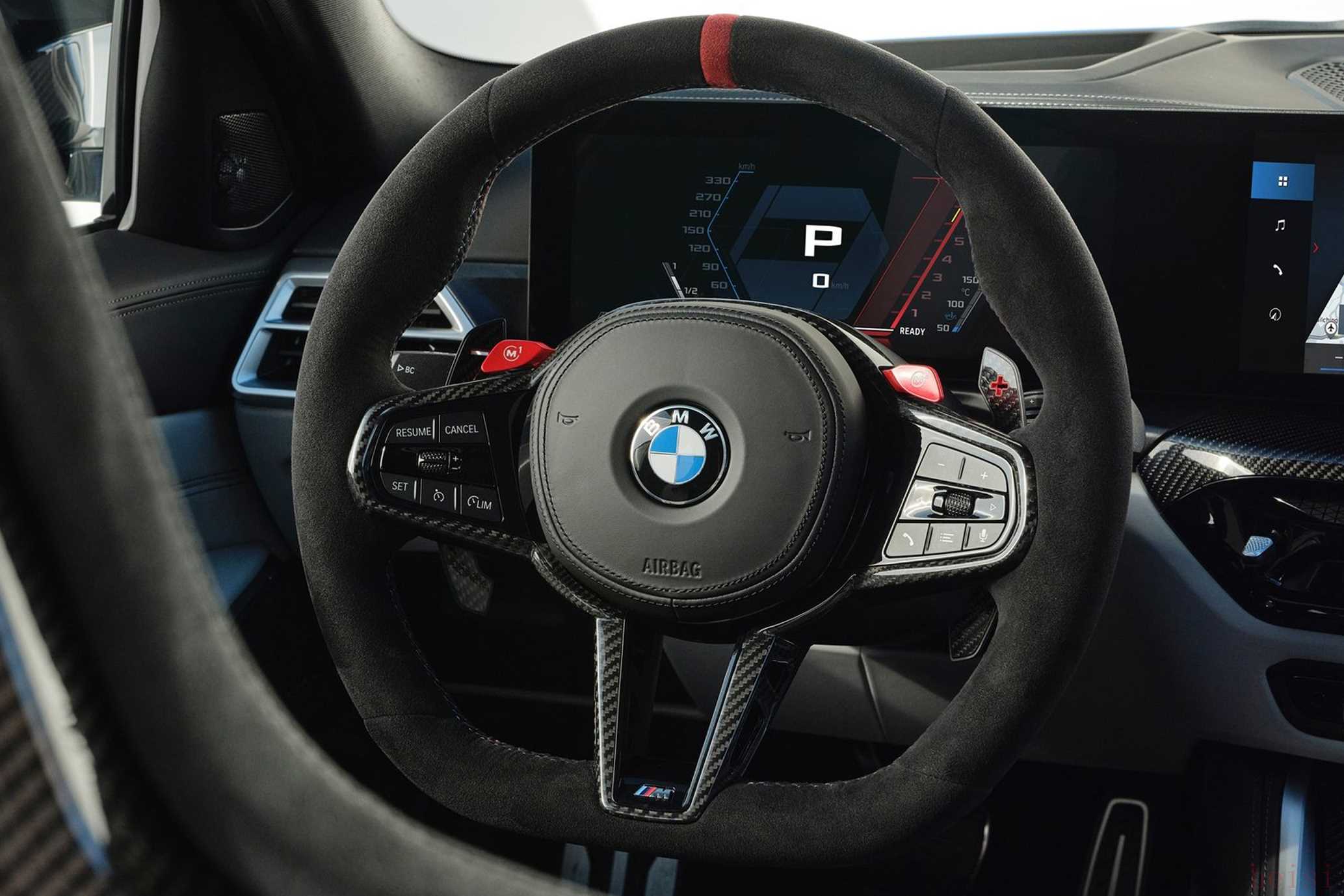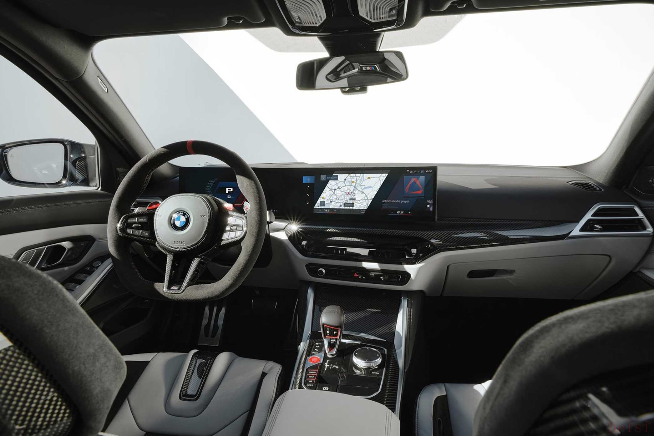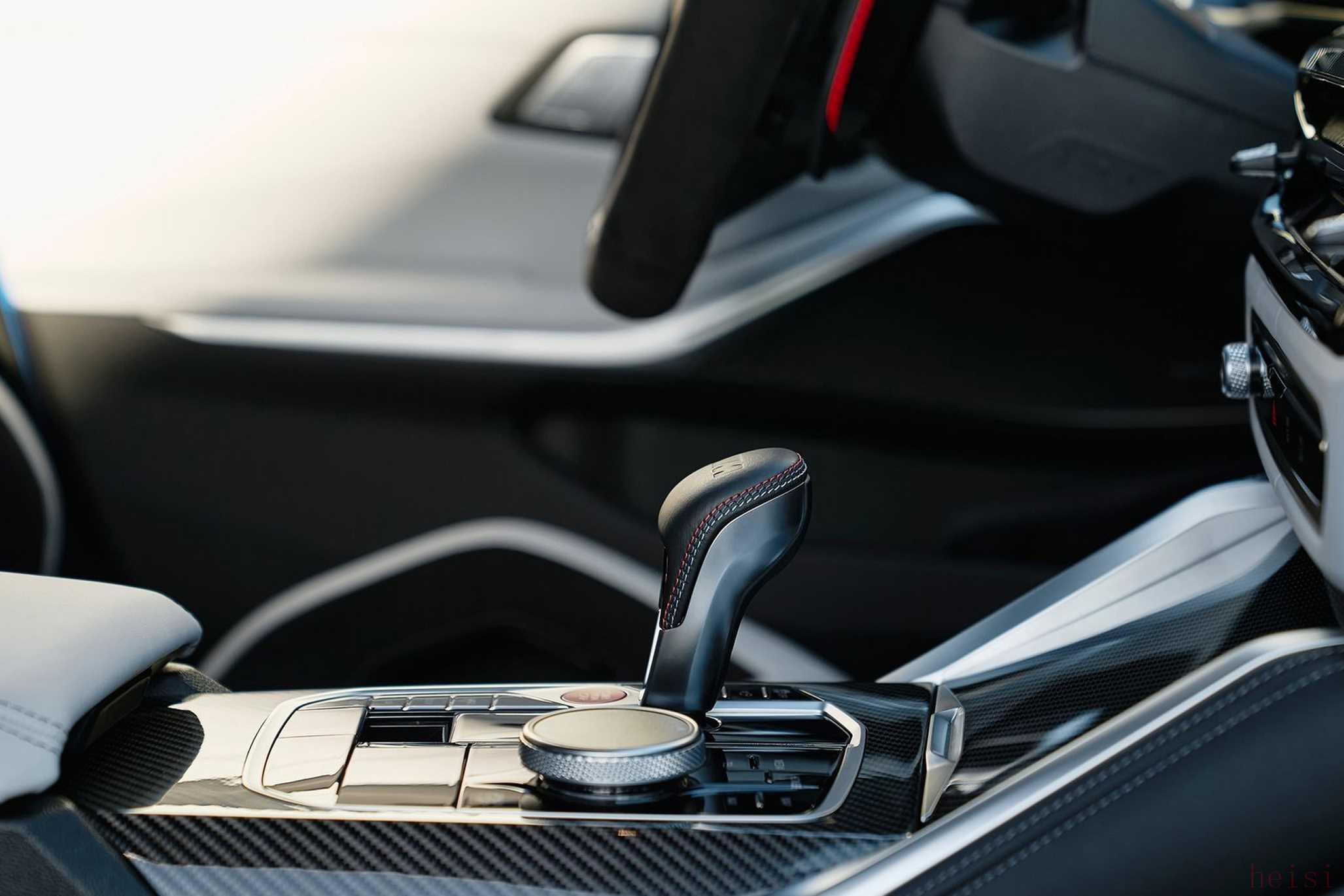 新款宝马M3旅行版的内饰与四门轿车版保持一致,搭载全新设计的多功能方向盘,同时配备搭载iDrive 8.5车机系统的曲面双联屏设计,而电子换挡机构保留了宝马经典的“鸡腿”挡把。