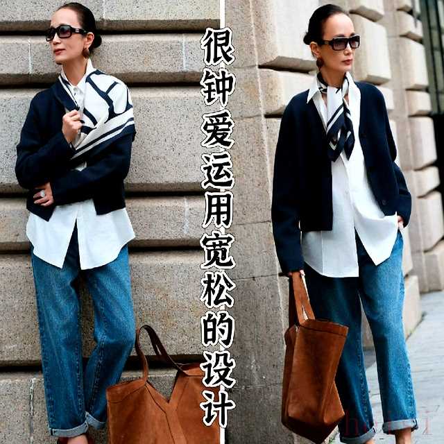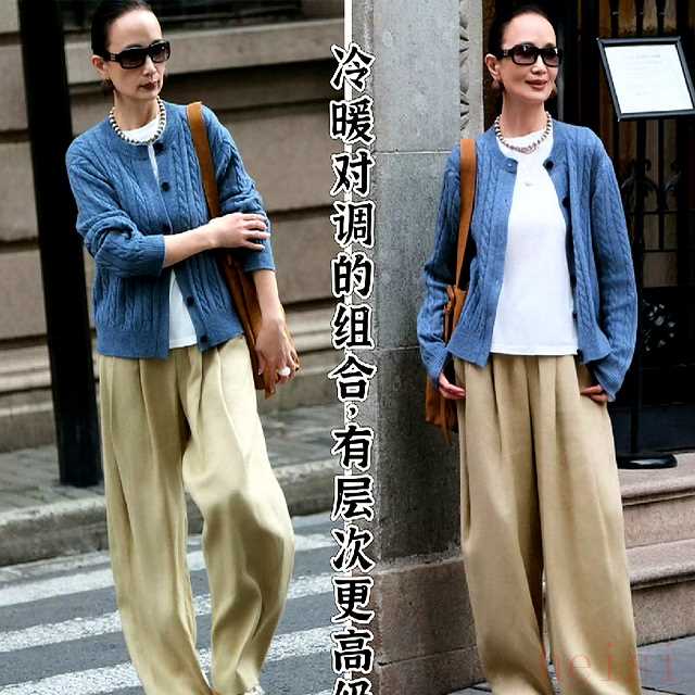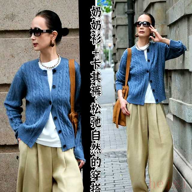 周末遛弯更简单。奶奶衫+卡其裤,奶奶衫选大一号,前面一半塞进去,后面放下来,遮住屁股,前面露出裤腰,腿立刻变长。她把裤脚卷两道,露出一截袜子,袜子颜色和奶奶衫上的条纹同色,上下呼应,拍照像杂志内页。
