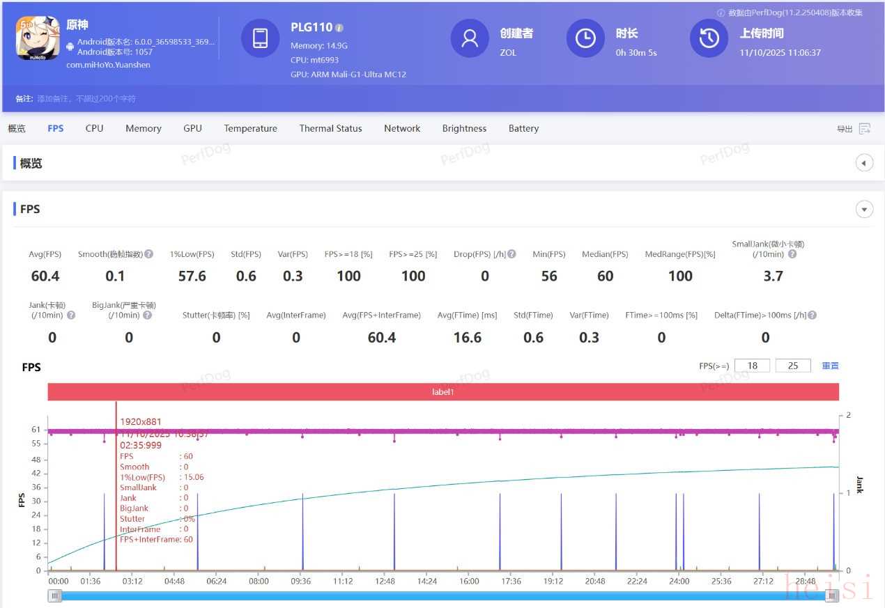 为了验证这套配置的性能表现,我们选择了30分钟《原神》须弥城跑图为测试模型进行游戏实测,在开启最高画质、60帧,结果如下: