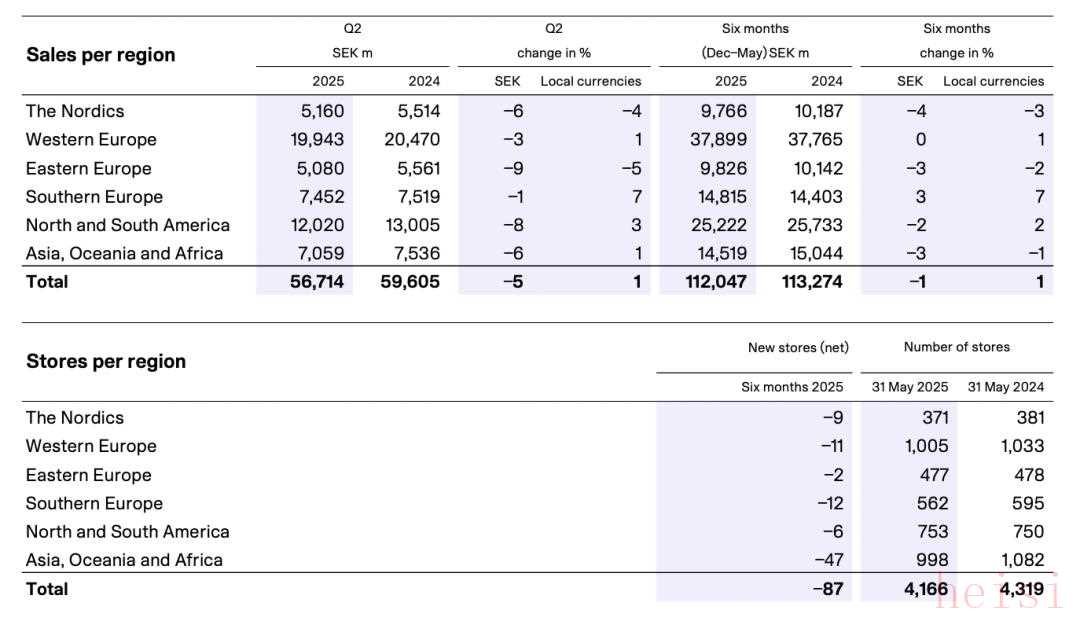 尽管整体销售增长承压,H&M集团第二季度(截至2025年5月31日)销售额同比增长1%,净销售额减少至567亿瑞典克朗。净利润为40亿瑞典克朗,较去年同期减少11亿。