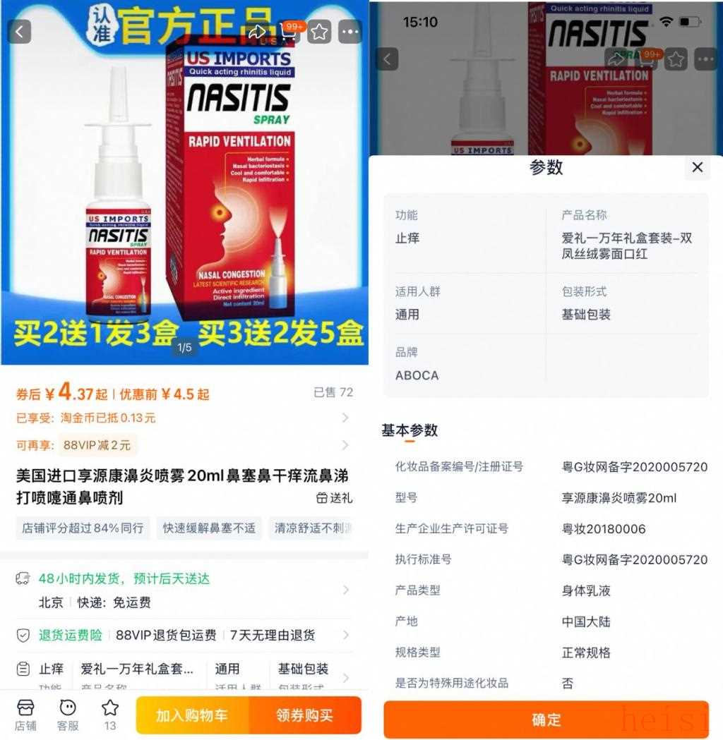 这款名为“享源康”的喷剂产品,在淘宝、抖音、拼多多、京东等多个平台在售,售价从2.5元至35元不等,多组合销售,最高月销77件。多家店铺的产品页面显示,该产品是“进口特效鼻炎喷剂”,使用“美国配方”,适用于鼻塞、鼻甲肥大、鼻窦炎等。