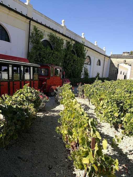接着要上一辆红色的小火车继续游园,心说这园子得多大啊还得用交通工具?这一转之下地方还真挺大的,Terry的面积和它比起来,大概只有它的1/4吧。小火车穿过绿树成荫没什么实际作用的大花园,路过了一片培育种苗研究用的巴掌大的一块葡萄田,拐进了Gonzalez Byass的主厂区。