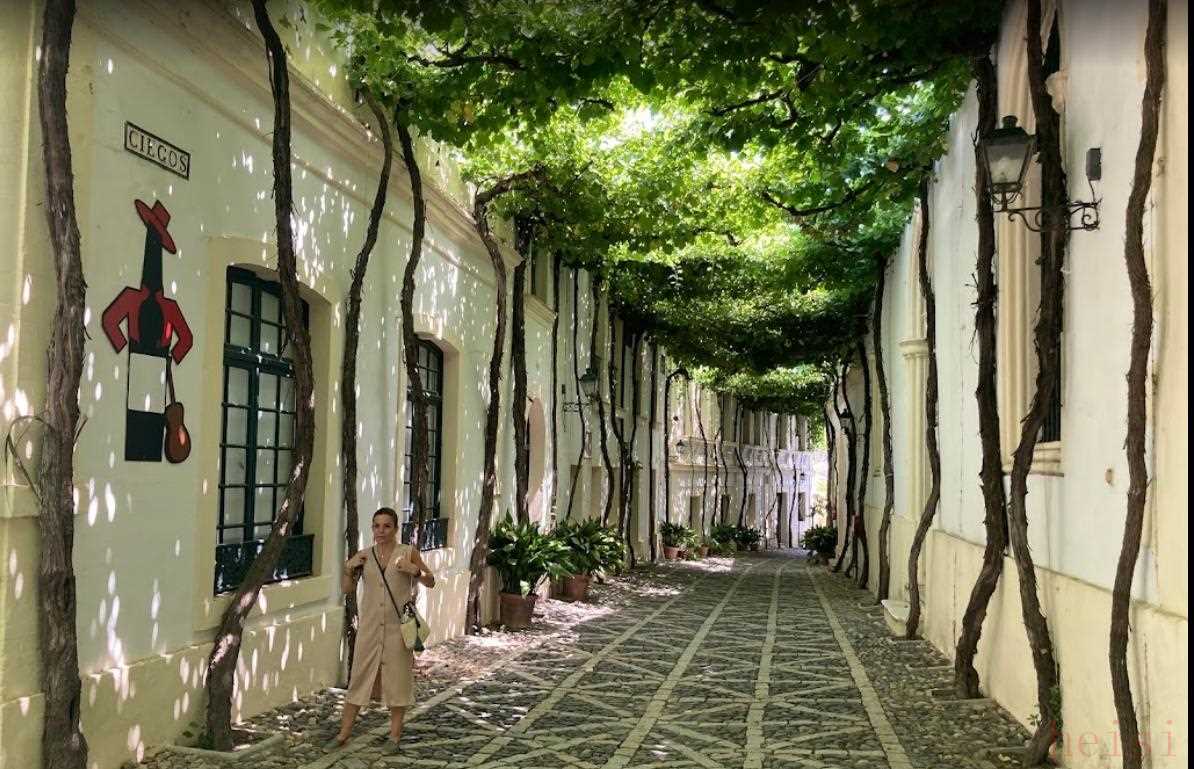 宴会厅外连接几间厂房的路的上空被更加茂密的葡萄藤覆盖,感觉十分梦幻。路的另一边连接的才是雪莉酒酒窖,一进门首先看到一个小小的有趣细节,在地上放置着一个盛满浓甜口味雪莉酒的酒杯,杯口搭着一个微型小梯子。旁边柱子上的照片揭示了这个小装置的意义,据说很早以前酒窖的工作人员发现经常有老鼠出没在酒窖里,在酒桶上嗑出洞来偷喝香甜的雪莉酒。工人放了一个盛满酒的杯子在地上还为它搭了梯子,没想到真的捕捉到了小老鼠来喝酒的图像,于是酒窖就开始保持在固定位置放上一杯雪莉酒的传统,既有爱又可以减少老鼠对于酒窖的破坏。只是看着照片里跃跃欲试的小老鼠,我估计喝了加烈酒之后它们大概也没力气藏起来了吧。