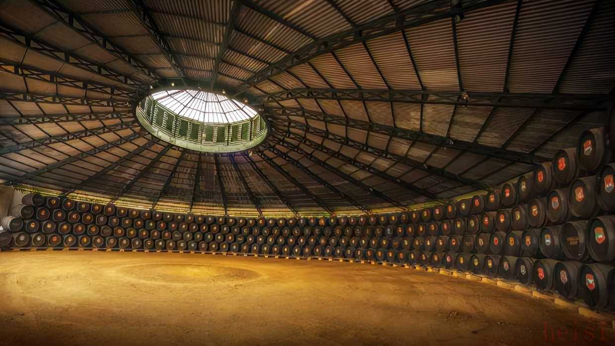 建筑里酒桶沿着圆墙堆起四层,每只桶上都有着不同国旗的浮雕,正中间则是Gonzalez Byass的字样,这些是用来代表进口他们家产品的国家。