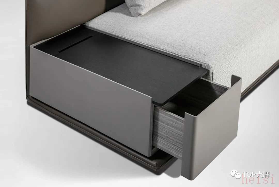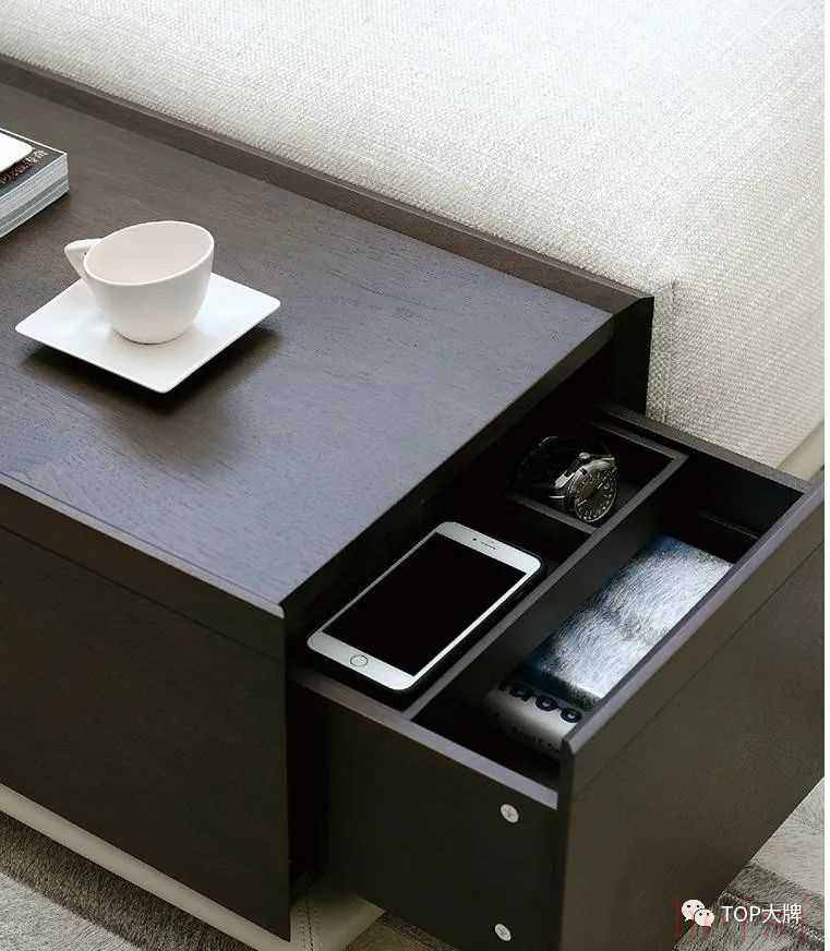 简洁的边几由木质和皮革拼接而成,内部的储物空间为使用增添了几分惬意。