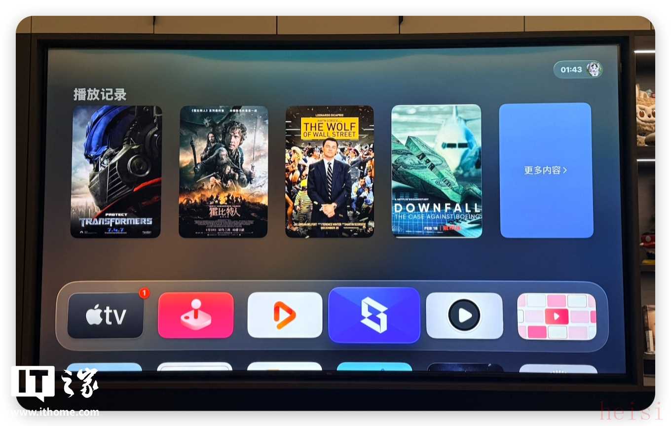 那么极空间在 Apple TV 上表现如何呢?我们先看看 UI,和 infuse 布局类似,并且在桌面也能够与 infuse 一样,直接显示最近播放的历史记录。
