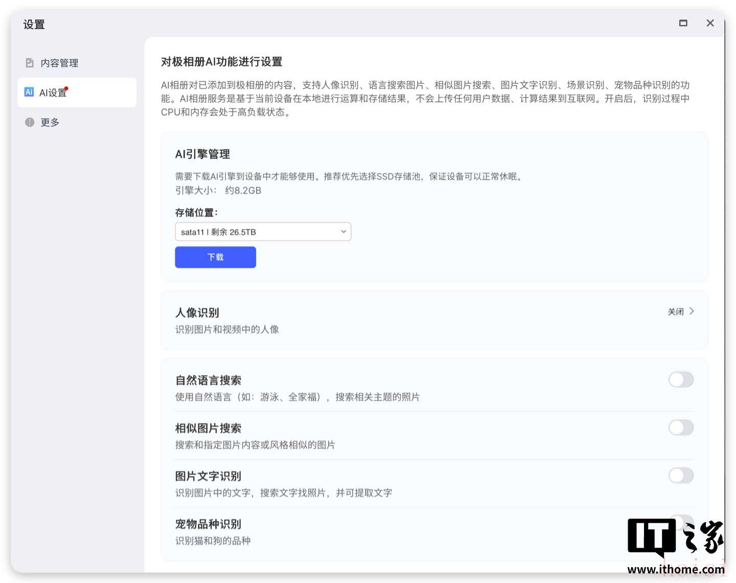 此外,极相册中还提供了 AI 引擎管理,首次使用需要先下载 AI 引擎,引擎有 8.2GB,下载后,就能够开启自然语言搜索、相似图片搜索、图片文字识别、宠物品种识别等一系列 AI 功能,并且识别都是基于本地模型在本地处理的,无需担心隐私安全,处理过程也是在后台无感进行的,对于图片、视频很多,且经常会新增照片的用户来说,大大降低了图库的管理难度,也提升了查找照片时的搜索效率。