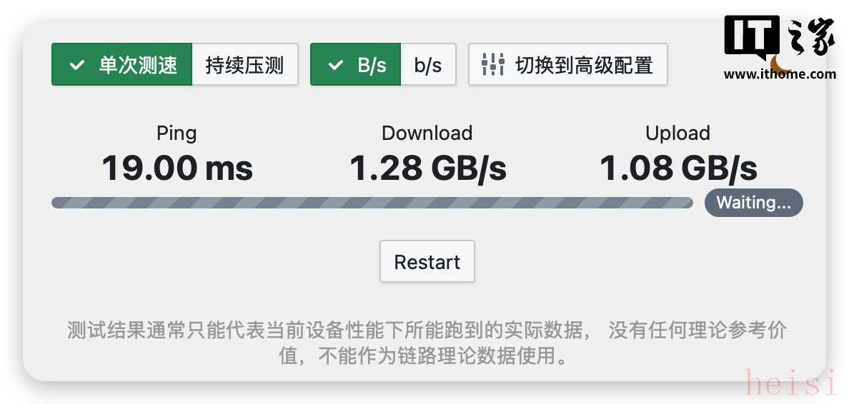 数据传输性能方面,考虑到此次 Z425 上固态硬盘的 M.2 带宽已经远超万兆网口的最大传输速率(1250MB/s),因此我们首先借助万兆交换机、万兆路由器以及 MacBook Pro 外接雷电 3 万兆网卡的全链路万兆内网进行测试,速度稳定突破了万兆。这里的万兆网速测试使用的是 Docker 内搭建的 Homebox,也是一款通用的内网网速测试工具。