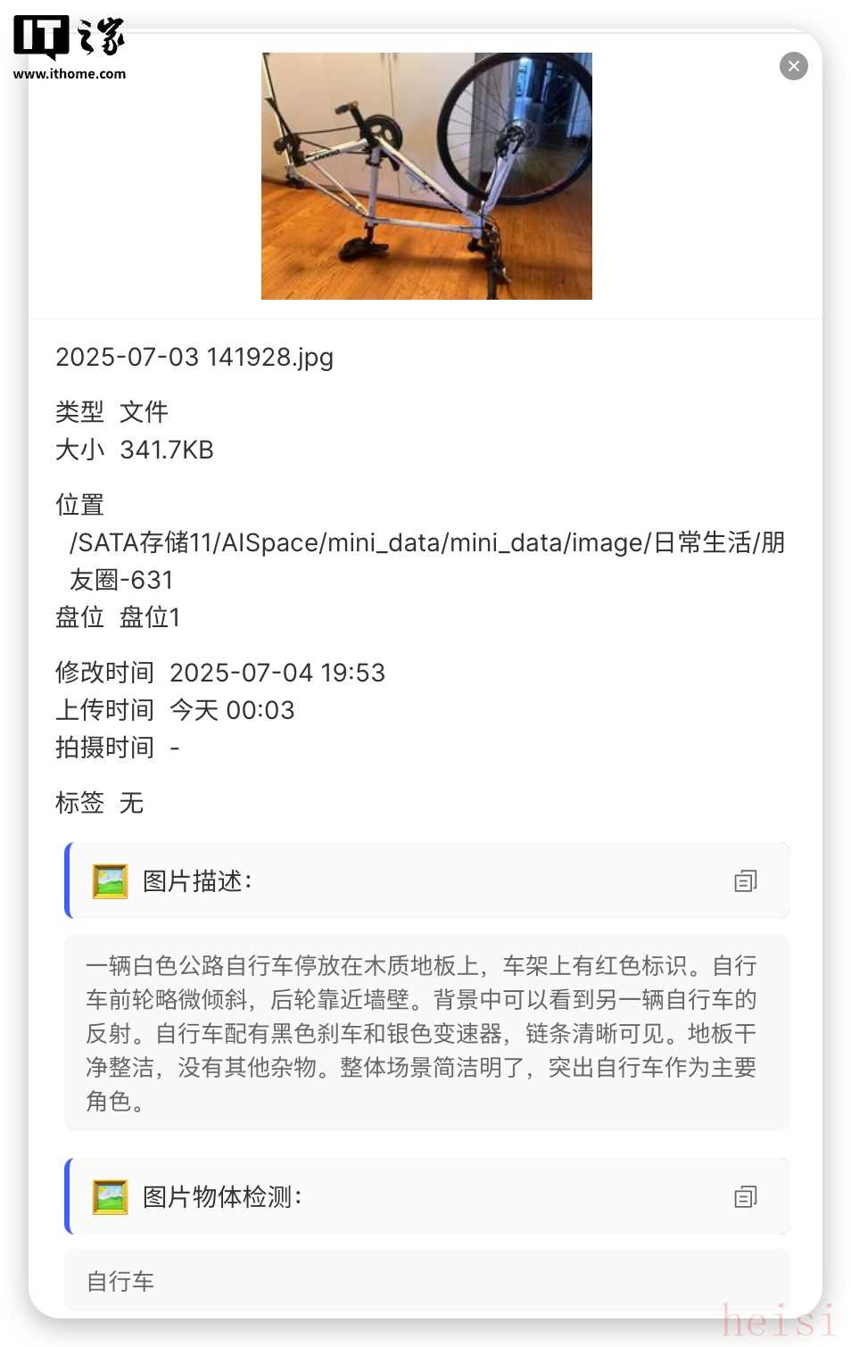 能够实现这种效果,也是得益于 AI 大模型在本地识别并对每个文件都打上了详细地说明和标签,我们随意选择一张图片,就能看到识别的结果。比如这张图片,可以看到 AI 不仅能够依靠其不常规的形态识别出它是自行车,并且对其进行的描述非常详尽,且十分准确。