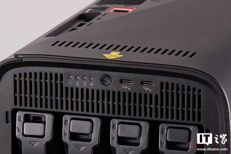 机身顶部的接口由前代的 USB-A + USB-C 更换为了双雷电四接口,这让 Z425 有了外接雷电扩展坞的能力,无论是外接独立显卡,还是外接雷电网桥,都完全可行,让 Z425 原本就已经很强悍的性能进一步得到拓展,如虎添翼。