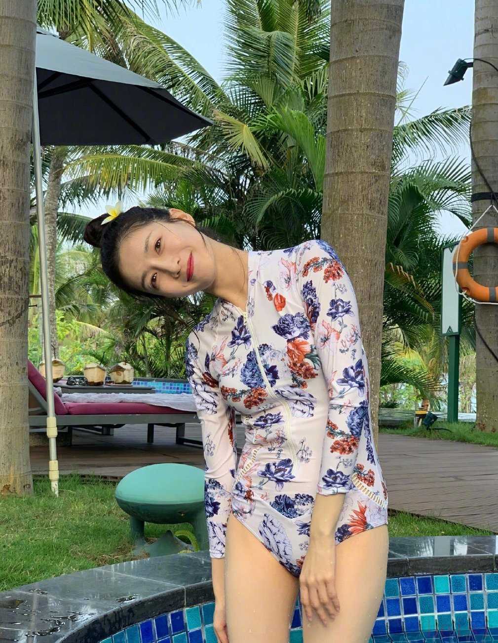 还有江疏影的三亚泳装照,丸子头配花泳装,低调秀身材也能让人心动不已。