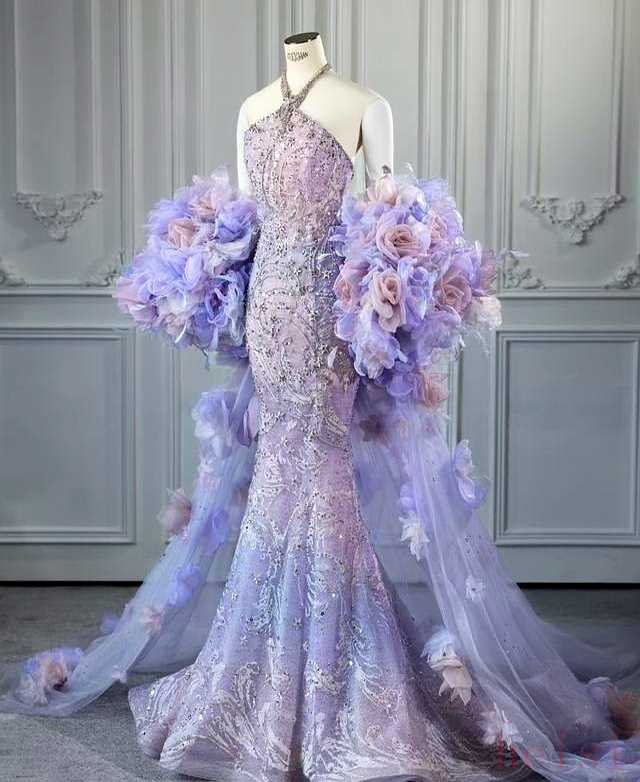 "描述:" 紫色婚纱显得格外高贵和独特,颜色浓郁,设计可能更华丽一些。