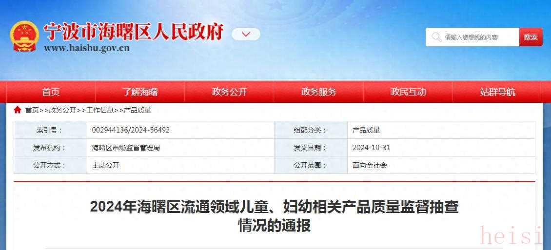 根据公开信息,浙江省宁波市海曙区市场监督管理局于2024年发布了关于流通领域儿童、妇幼相关产品质量监督抽查情况的通报。